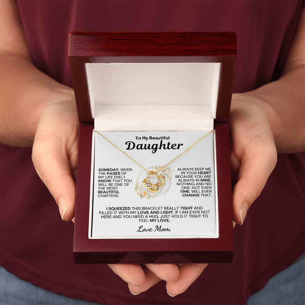 To My Beautiful Daughter Someday, when the pages of my life end, I know that you will be one of the most beautiful chapters. Always keep me in your heart because you are always in mine. Nothing and no one, not even time, will ever change that. I squeezed this bracelet really tight and filled it with my love and light. If I am ever not here and you need a hug, just hold it tight to feel my love. Love Mom